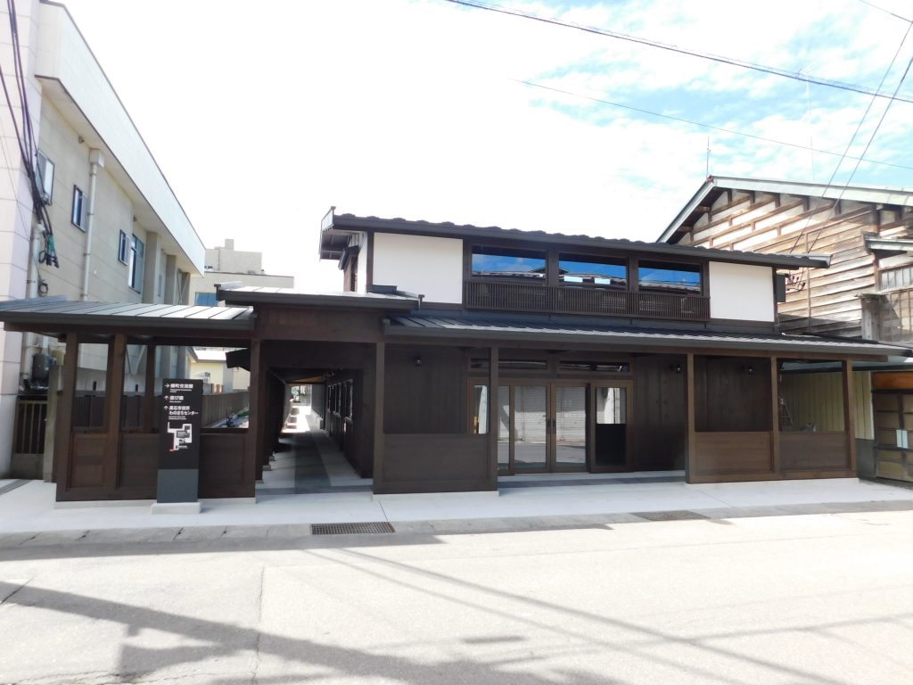 弊社が担当した「横町交流館」は、「わのまちセンター」の市民交流および休憩所機能を担うものとして、古くからの商店街である横町に面する一画に別棟として計画された。黒石市の伝統的建造物の様式に準じた意匠を採用したデザインとしているが、これは、計画地を含む街区が、令和2年4月に防火地域から準防火地域に変更となったため、伝統的な木造建造物に準じた意匠での計画が可能となったことが大きな要因である。また、黒石市の伝統的な町並みの意匠である「こみせ(木造アーケード)」の設置も容易になった。本計画では、長い間、伝統的な町並み再生が難しいと考えられていた横町に、この「こみせ」の連なりを先導することを意図しているが、本計画の工事中から、周辺の商店に「こみせ」設置の機運が高まり(いくつかは実現している)、民間も連動したエリアリノベーションに繋がり始めたことは喜ばしいことであった。